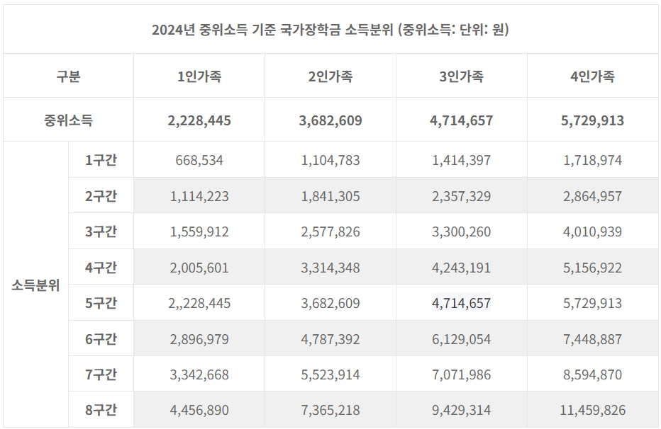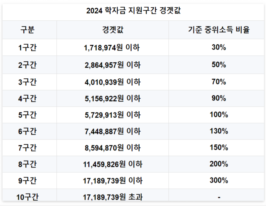 한국장학재단은 보건 복지부에서 발표하는 기준 중위소득과 연계해 소득분위 별로 학자금 지원구간 경곗값을 매 학기마다 조정하는데요. 2024년 중위소득 기준 한국장학재단 국가장학금 소득분위와 학자금 지원구간 경곗값은 아래의 표와 같습니다.